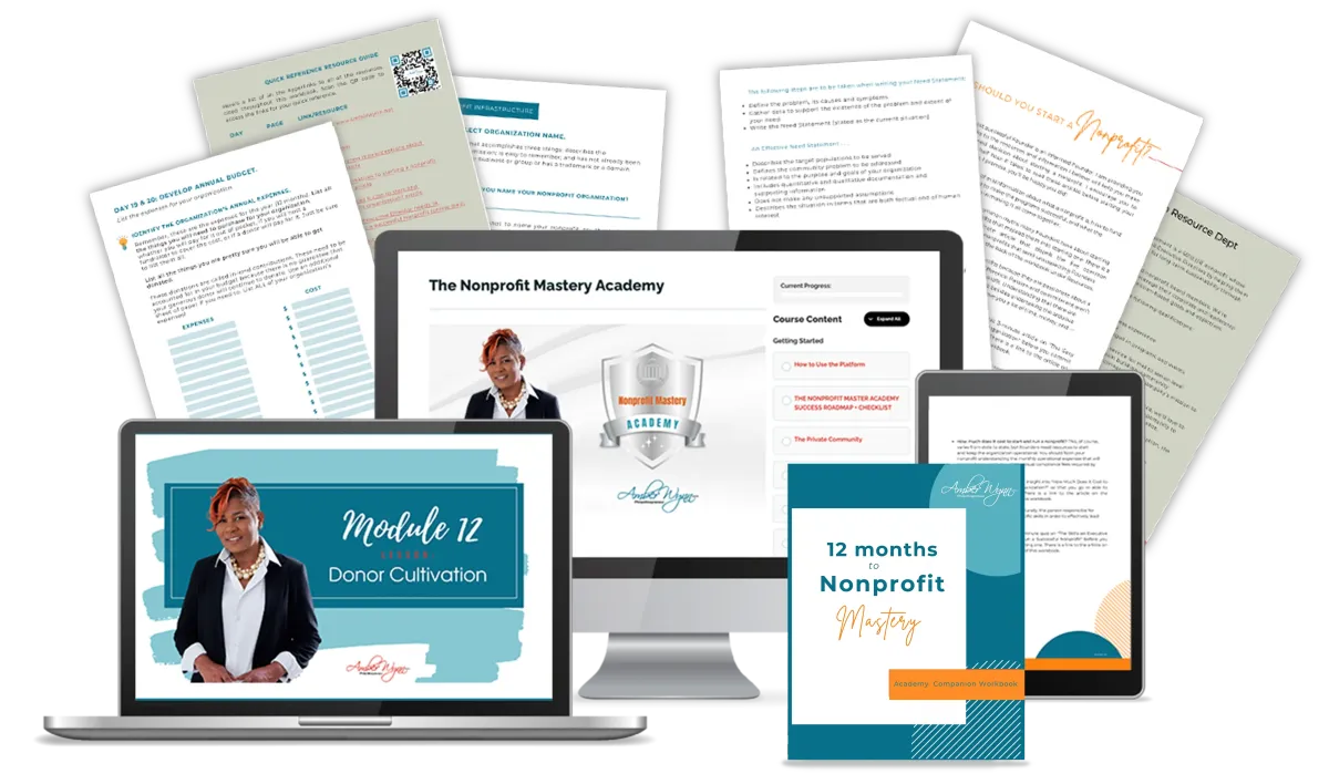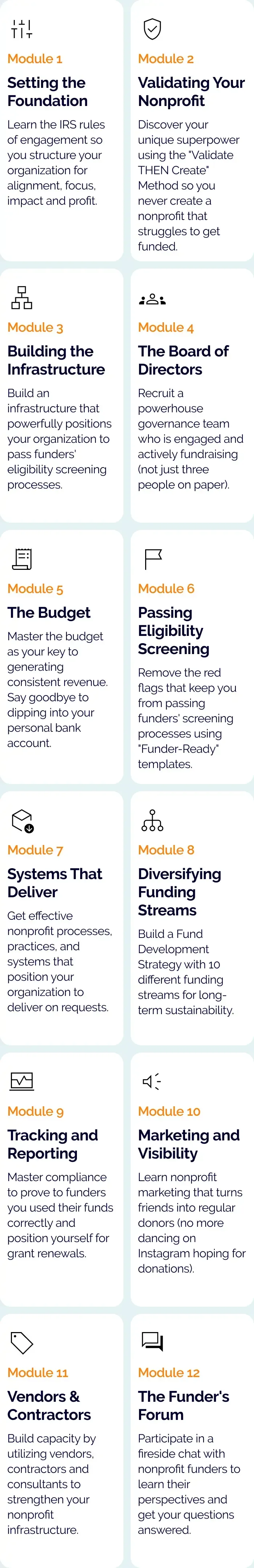Most other courses only give you one piece: fundraising, grant writing, marketing, or board development. The Nonprofit Mastery Academy is a comprehensive crisis-proof system for building a sustainable nonprofit that can secure funding even in challenging economic times. You get everything you need in one place - but success requires your full commitment to implementation.